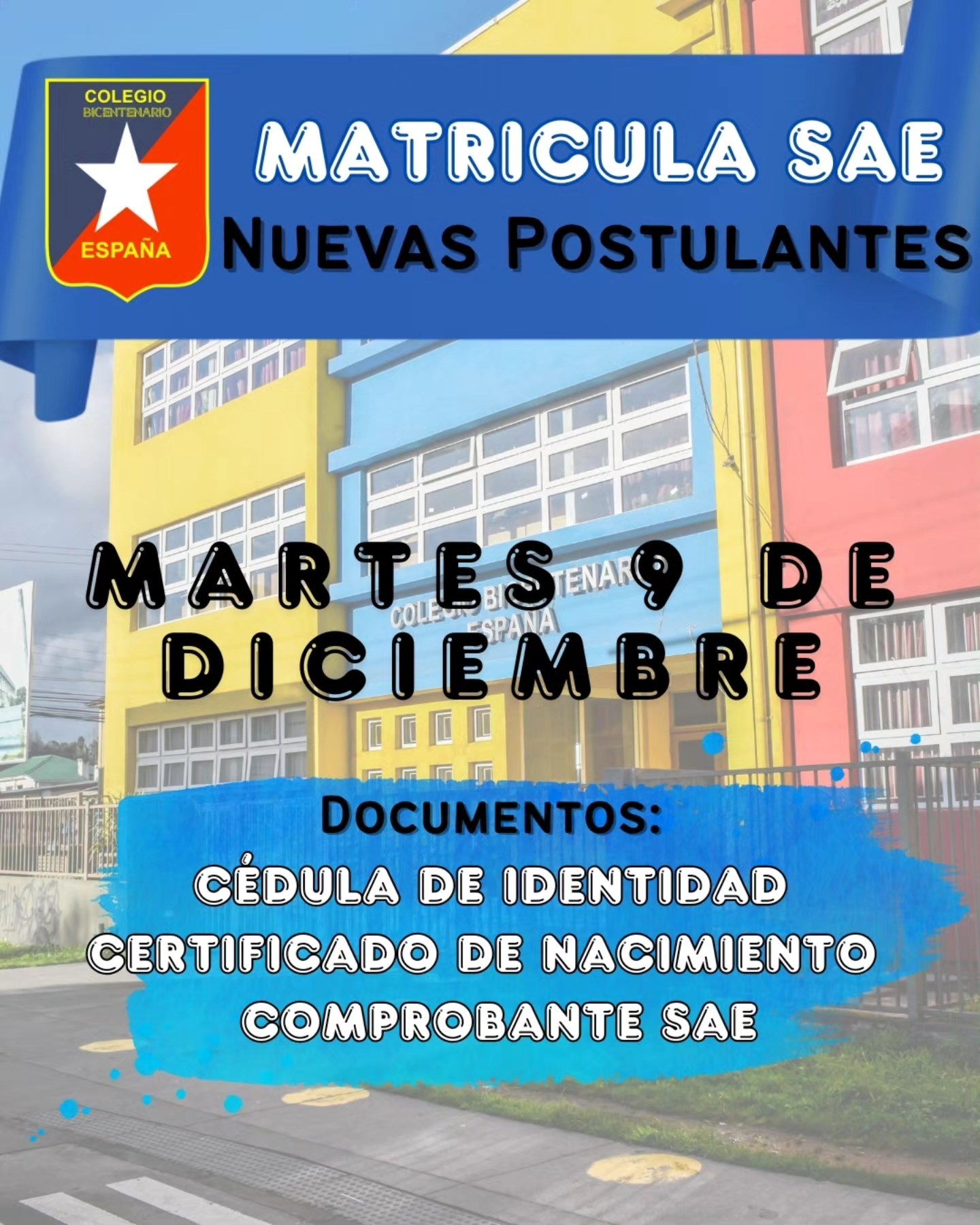 - Martes 9: Matricula SAE (Estudiantes Nuevas). Documentación:
